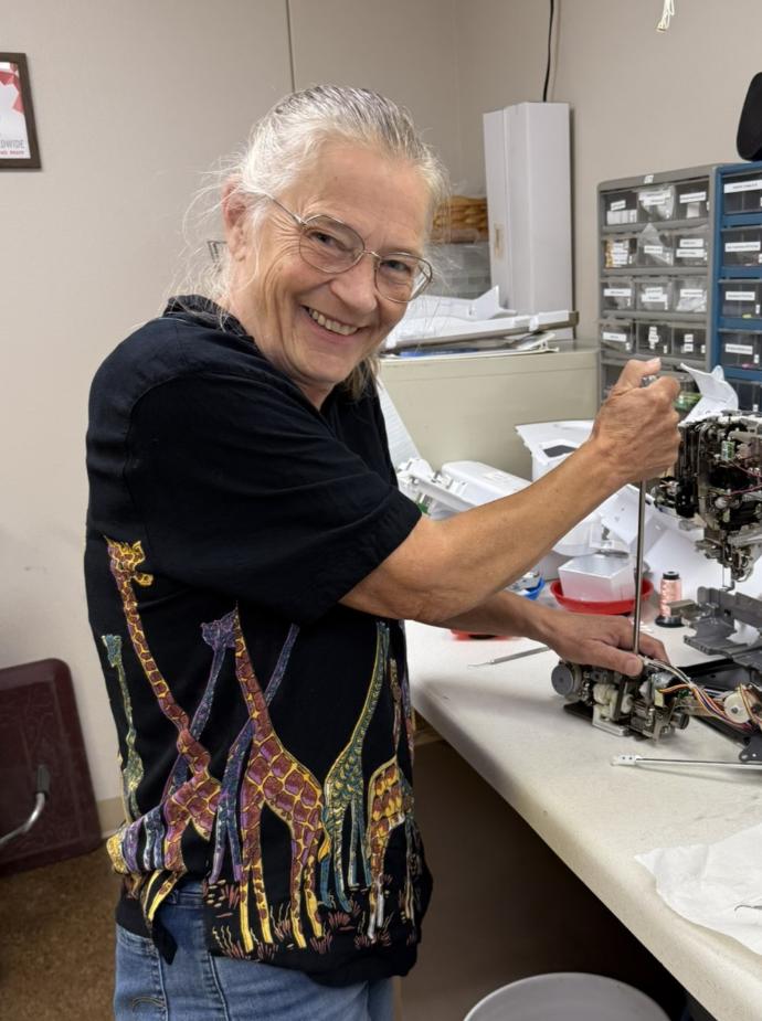 Mariann was formerly an elementary school teacher and she shares that talent with all the budding sewers during youth sewing classes and camps. Have you ever noticed the back wall of blenders looks particularly well colorized? That's all Mariann's hard work. Every few weeks she does a great clean up for us and puts all the bolts back just where they belong.